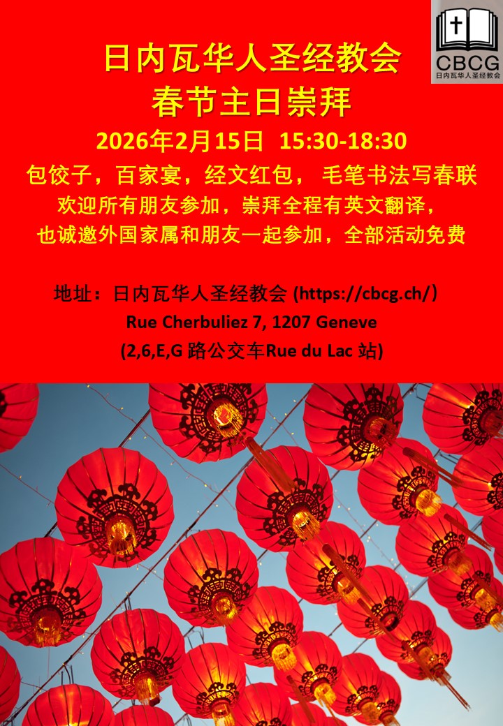 Chinese Bible Church of Geneva 日內瓦华人圣经教会 主日崇拜 每周日下午3:30,Rue Cherbuliez 7,公车站 Rue du Lac, 公车2,6、E、G 教会YouTube频道 活动动态 更多资料 讲道 更多资料 月报 更多资料 主日崇拜 时间: 每週日下午三點半 地点: Rue Cherbulier 7 1207 Geneve, Switzerland 奉献和捐助 轉入PostFinance的帳戶 Account number: 17-62686-0 IBAN: CH20 0900 0000 1706 2686 0 BIC: POFICHBEXXX Name: L’EGLISE BIBLIQUE CHINOISE GE 联系我们 更多资料